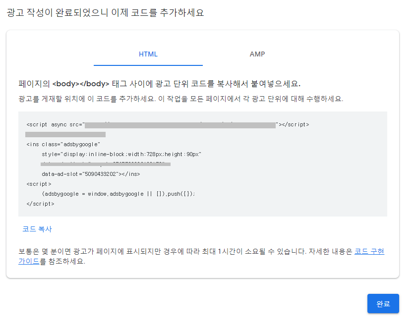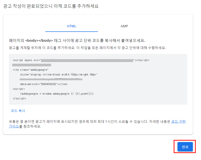 그리고 애드센스로 돌아와 완료 버튼을 눌러주세요.