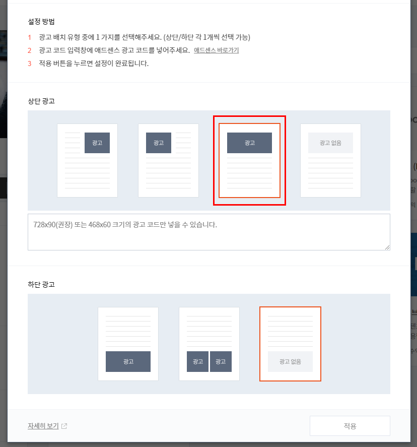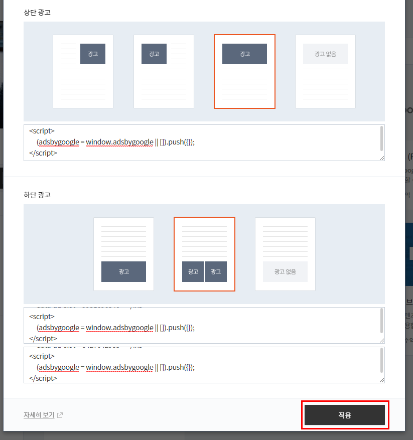 티스토리 설정에서 애드센스 광고 코드를 동일한 방법으로 모두 넣어준 다음 적용 버튼을 눌러주세요.