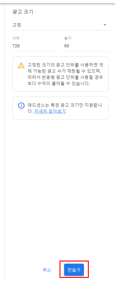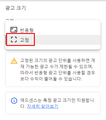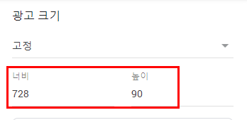 오른쪽으로 시선을 이동하면 광고 크기를 설정할 수 있는 부분이 보이실 거예요.