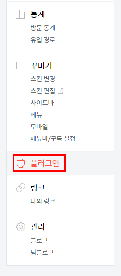 티스토리 블로그 관리 페이지에서 플러그인 메뉴를 눌러주세요.