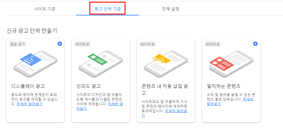 나오는 탭 중에서 광고 단위 기준 탭을 눌러주세요.