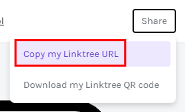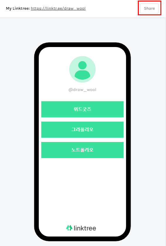 이제 링크 트리 주소를 공유해볼까요? 미리 보기 페이지 위쪽에 보면 Share 버튼이 있어요. 클릭해주세요.