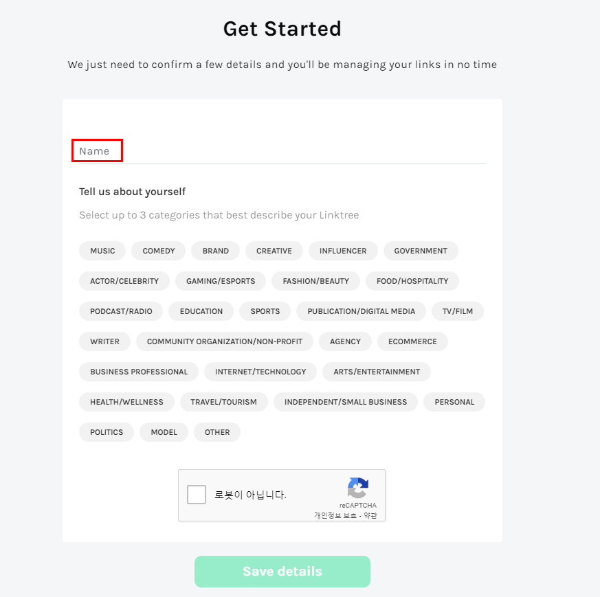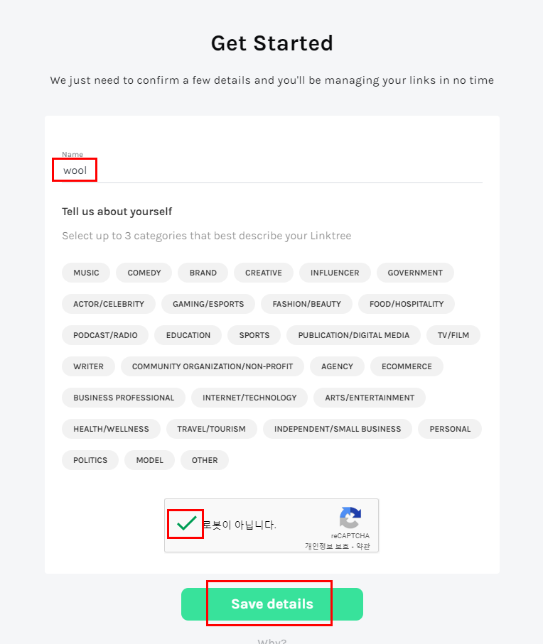 닉네임을 설정하셨다면 로봇이 아닙니다에 체크해주시고 Save details 버튼을 눌러주세요.