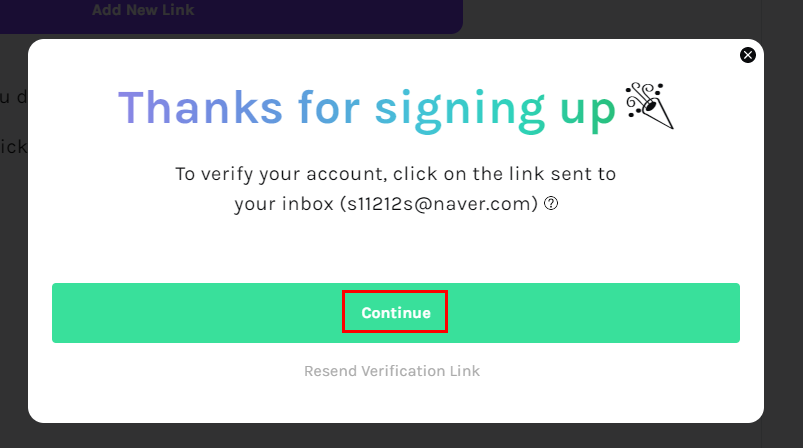 가입을 완료하신 걸 축하드려요. 이제 Continue를 눌러서 본격적으로 링크를 설정해봅시다.