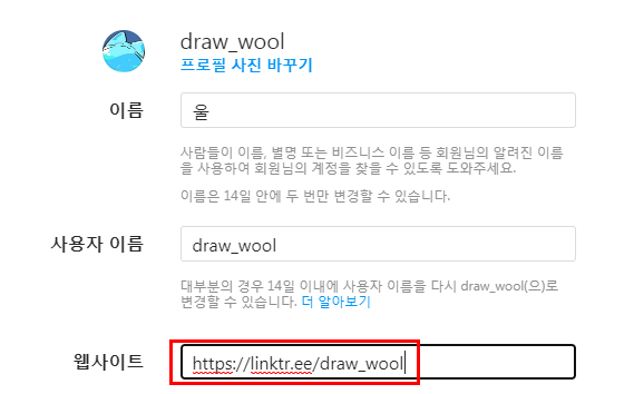 프로필 편집 페이지에 들어와서 웹사이트 칸에 복사한 링크 트리 주소를 붙여 넣어주세요.