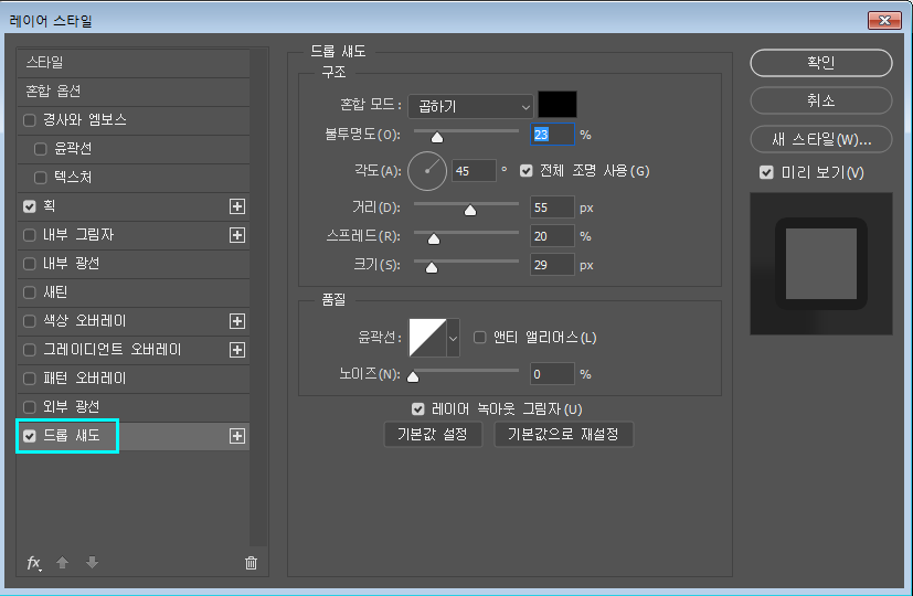 레이어 스타일에서 드롭 섀도를 넣고 수치를 조정해줍니다.