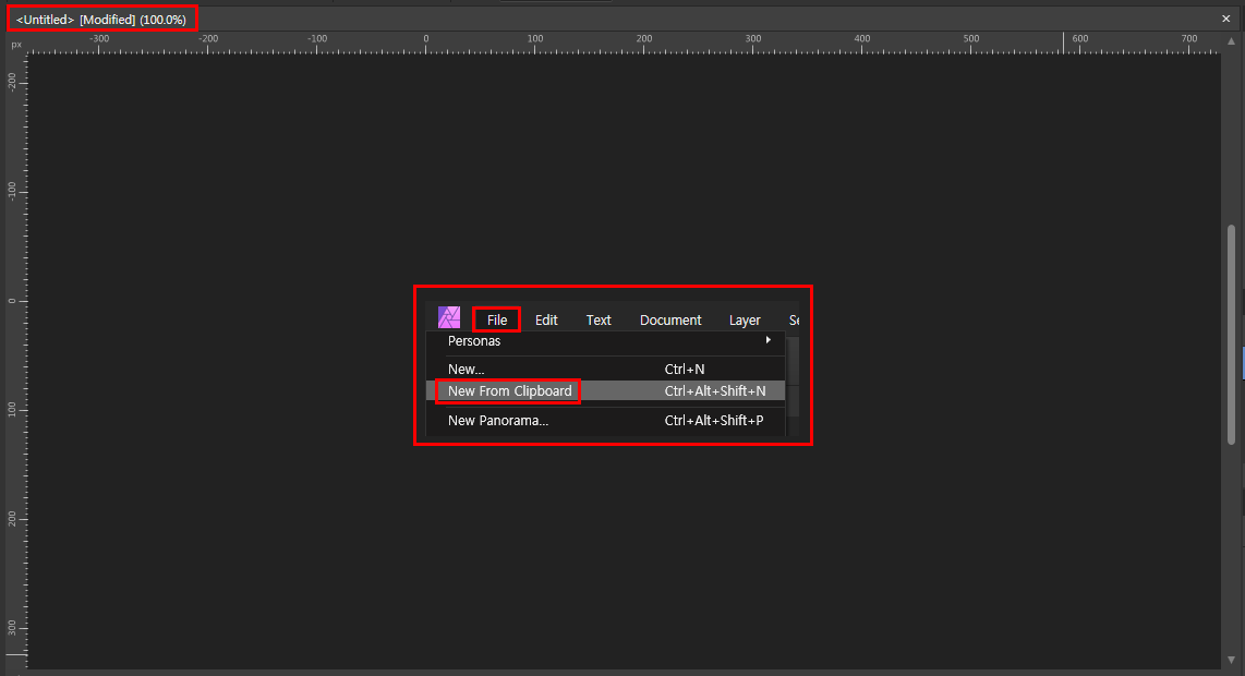 먼전 어피니티 포토를 열어주시고 File > New From Clipboard를 눌러주세요.