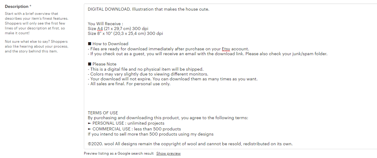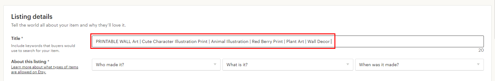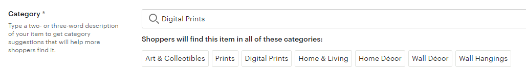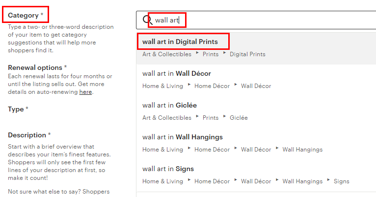 가장 먼저 타이틀! 제목을 적는 칸입니다. 자신이 판매하는 상품을 미리 엣시에 검색해보시고 어떤 식으로 제목을 쓰는지 벤치마킹을 해보세요. 저는 Wall Art를 검색해서 여러 상품을 벤치마킹해봤어요.