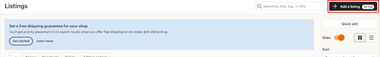 이 버튼을 누르면 리스팅을 추가할 수 있는데요. 엣시는 추가할 때마다 일정 수수료를 받아요.