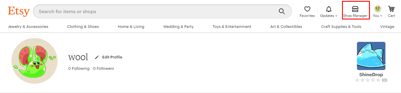 엣시에 로그인을 한 뒤 오른쪽 상단 샵 매니저 버튼을 눌러주세요.
