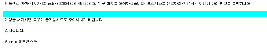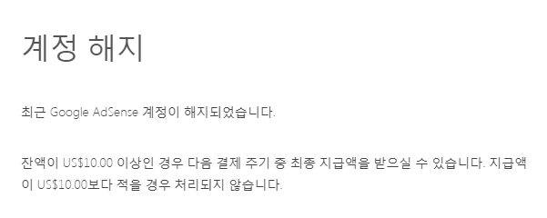 애드센스에 다시 들어와 보면 이렇게 해지되었다는 문구가 뜹니다.