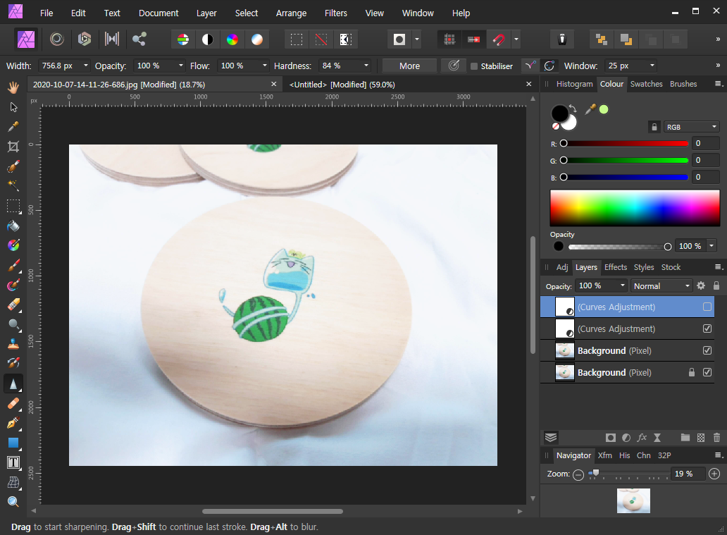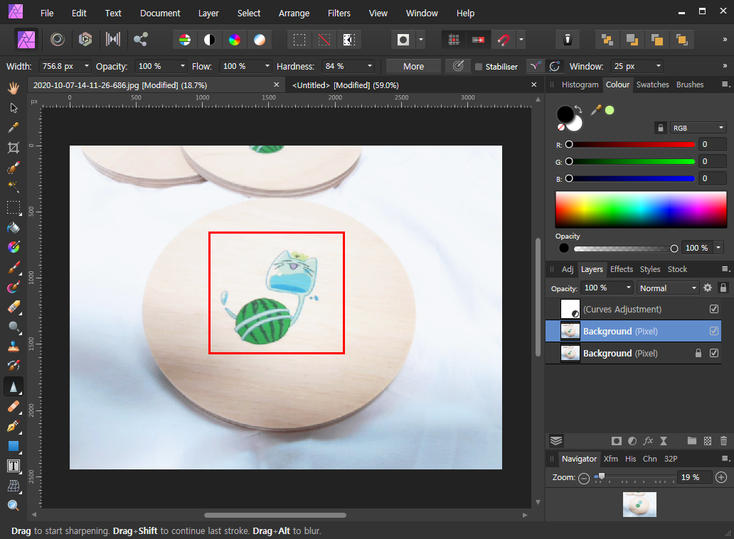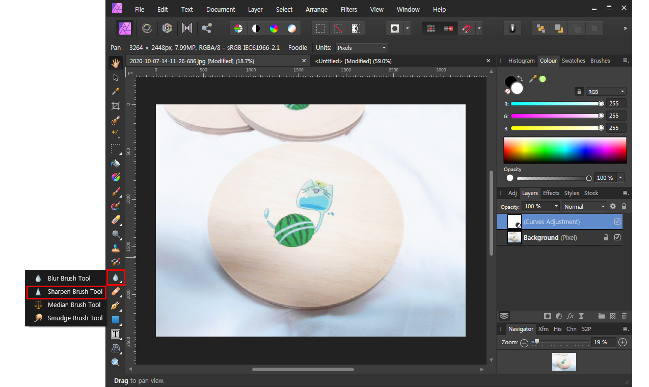 샤펜브러쉬는 약간 선명하게 보이도록 도와주는 도구인데요. 브러쉬 크기를 조절해서 제품을 좀 더 선명하게 살살살 문질러줍시다. 너무 세게 하면 타니까 살살해주세요. 원본과 비교를 하고 싶다면 미리 레이어를 복사해주고 복사한 레이어에 작업해주세요. 저는 미리 복사해놨습니다.