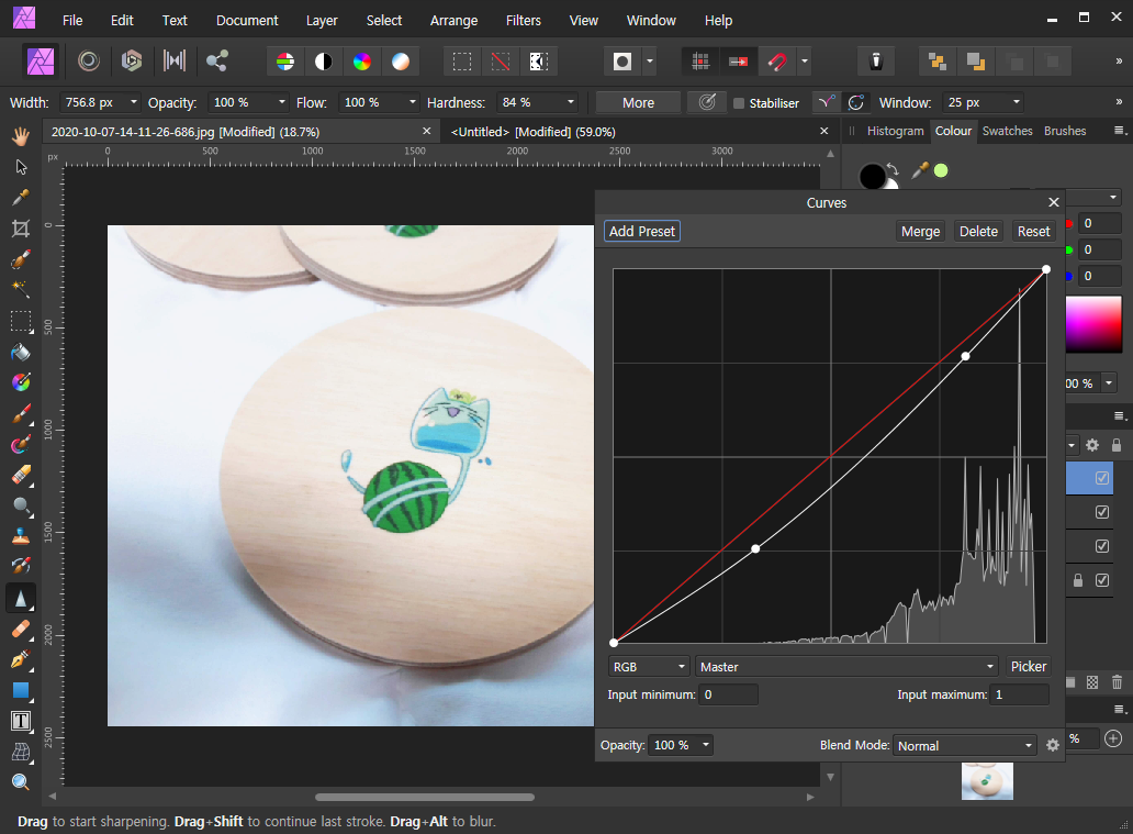 이런 식으로 s모양이 나오게 조절해줍니다. 저러면 밝은 부분은 더 밝게 어두운 부분은 더 어둡게 되어서 대비 효과가 더 강해져요. 이미지에 따라 곡선 모양이 다르니 이미지를 보면서 조정해줍시다.