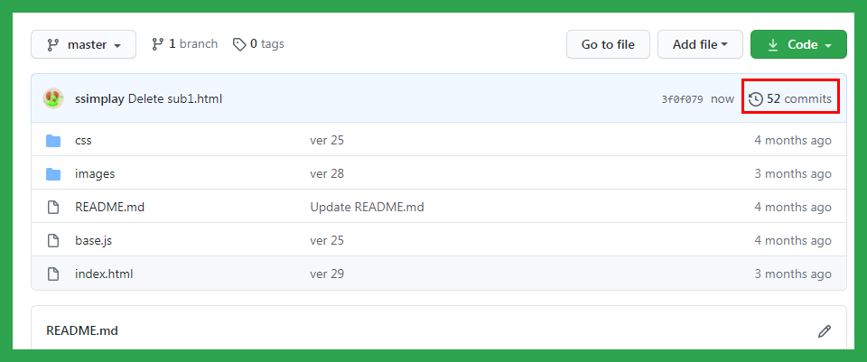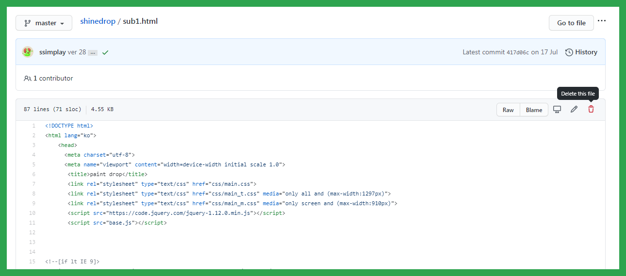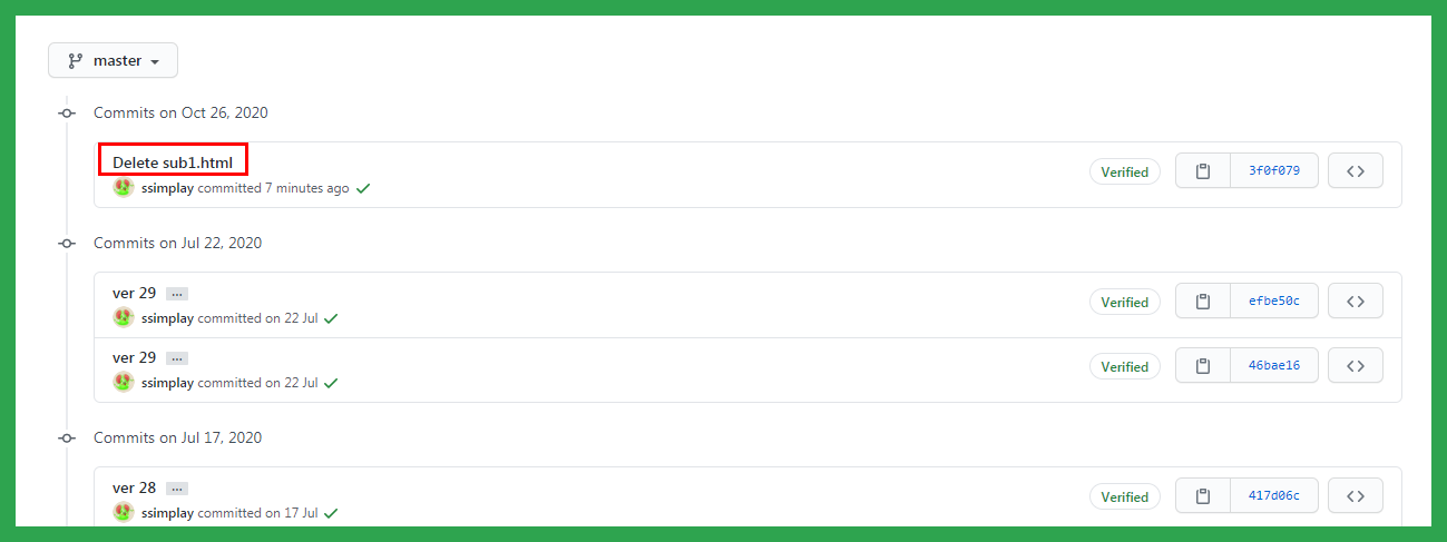 그동안 작업했던 기록을 살펴볼 수 있습니다. 가장 위에 파일 삭제 기록이 있을 겁니다. 이런 식으로 깃허브에서 작업 내역까지 확인할 수 있습니다.