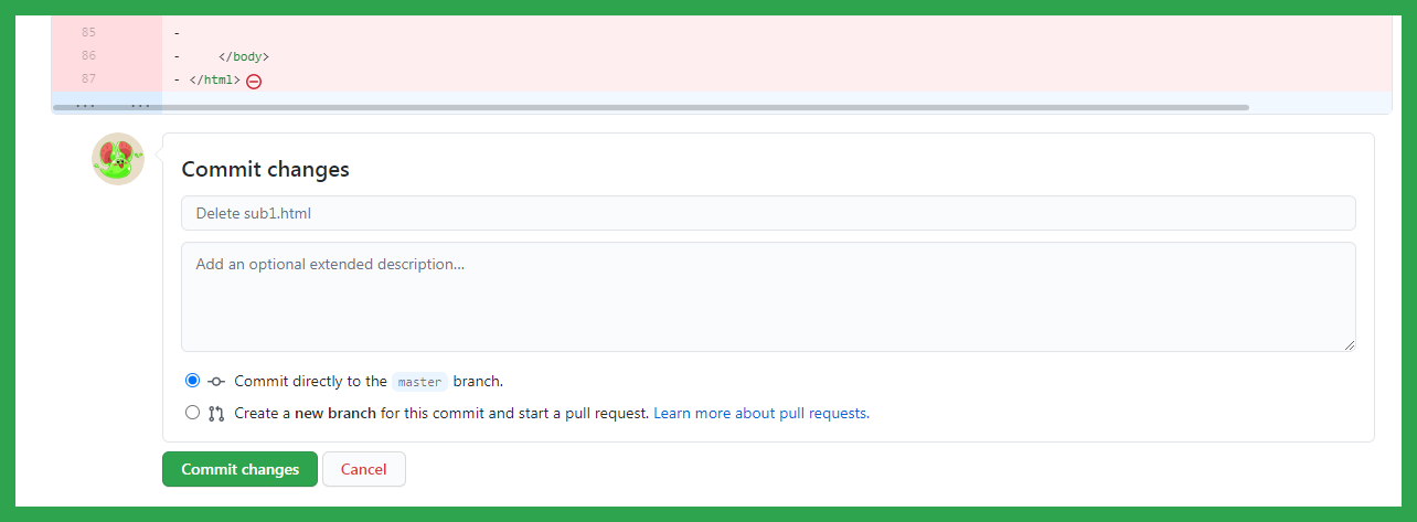 버전 관리의 대명사답게 파일이 삭제되면 코멘트를 입력할 수 있는 페이지가 나옵니다. 관리를 위해 적어주셔도 좋고 적지 않아도 좋습니다. 모든 단계가 끝났다면 아래 Commit Changes라고 쓰여있는 녹색 버튼을 눌러서 작업을 완료합니다.