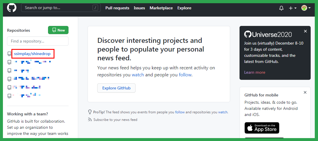 깃허브에서 수정하고 싶은 프로젝트에 들어갑니다. 메인화면 좌측에서 원하는 프로젝트를 클릭합니다.
