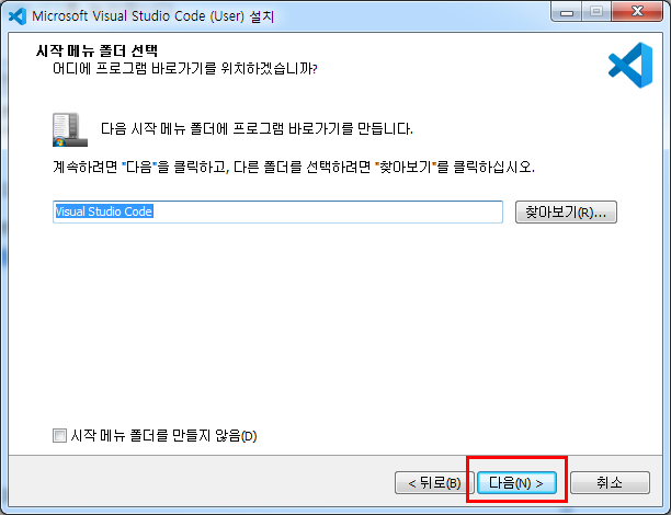 시작 메뉴에 프로그램 바로가기를 만들지 결정할 수 있습니다. 기본은 만들게 되어있고 만들고 싶지 않다면 체크박스를 선택해주시면 됩니다. 결정하셨다면 다음을 선택합니다.