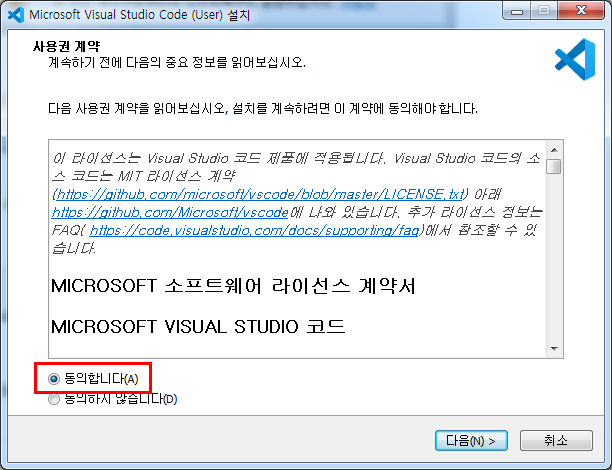 라이선스 정보가 나오는데 동의합니다를 눌러줍니다.
