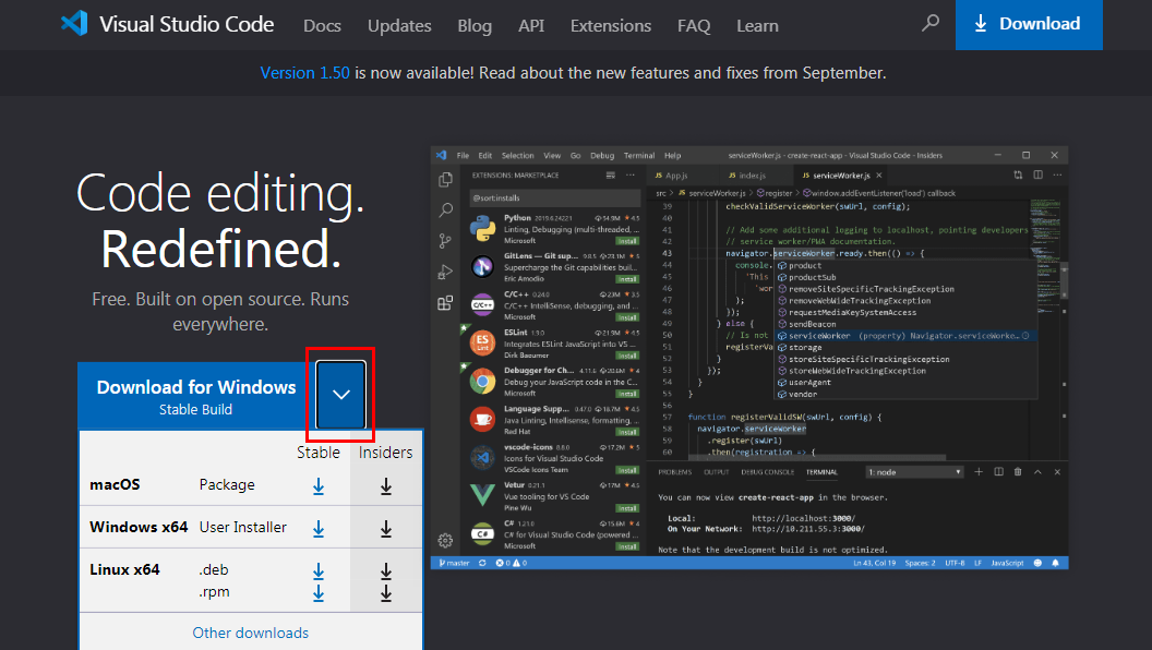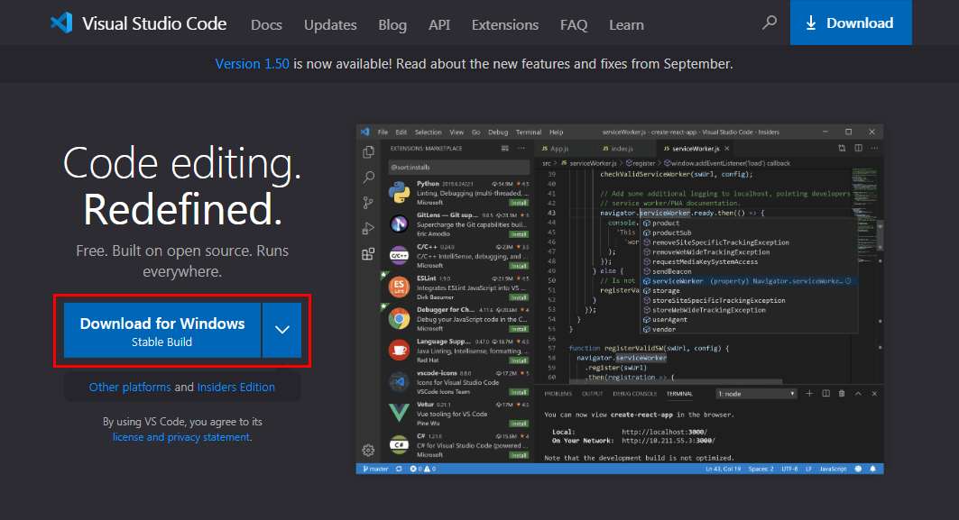 Visual Studio Code is a code editor redefined and optimized for building and debugging modern web and cloud applications. Visual Studio Code is free and available on your favorite platform - Linux, macOS, and Windows.