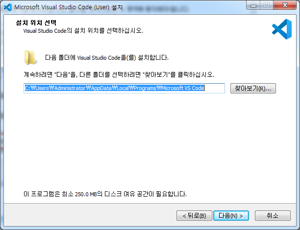 설치 위치를 선택할 수 있는데요 기본 위치에 설치해보겠습니다. 설정했다면 다음을 눌러줍니다.