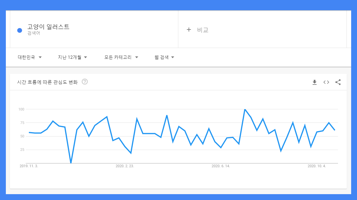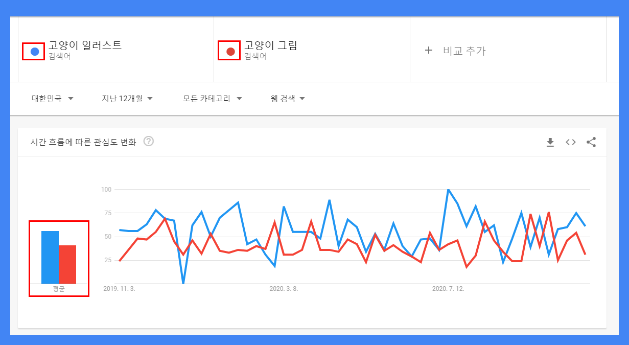 두 키워드는 거의 비슷한 검색량을 보이긴 합니다만 평균을 보시면 고양이 일러스트 키워드가 조금 더 높습니다. 두 키워드 중에 고민하고 있었다면 조금 더 검색량이 높은 키워드를 고르면 됩니다.