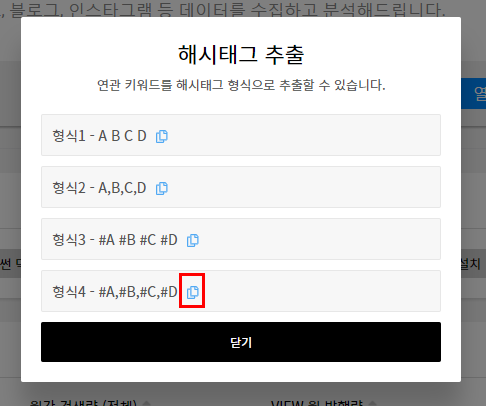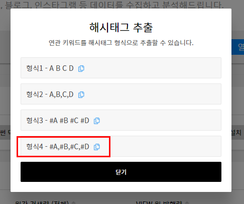 해시태그 추출 팝업창이 뜨면서 형식을 고를 수 있게 해 줍니다. 4번 형식을 복사하면 간편하게 해시태그로 활용이 가능해 보입니다.