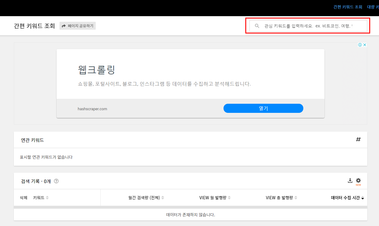 간편 키워드 조회 페이지로 넘어와서 이번에도 역시 오른쪽 상단쯤을 보면 검색창이 있습니다. 관심 키워드를 입력하라는 안내 문구가 친절하게 보이니 여기에 검색을 해봅시다.