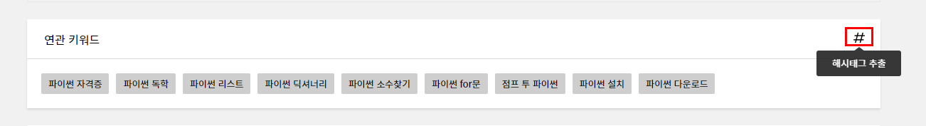 블랙 키위만의 특별한 기능이 하나 더 있습니다. 해시태그 추출이라는 기능인데, 연관 키워드 박스 오른쪽 상단 #(샵) 모양 위에 마우스를 올려보겠습니다. 해시태그 추출이라는 문구가 나옵니다.