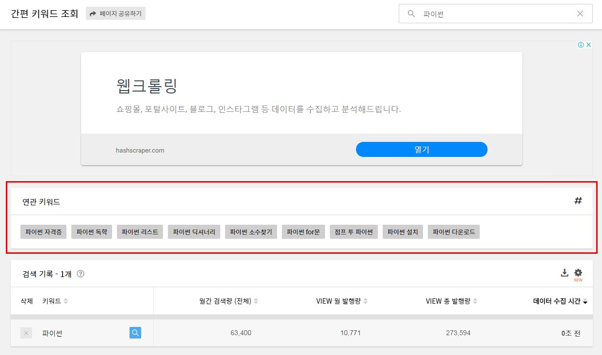 처음에는 없었던 연관 키워드들이 파이썬을 검색하니가 주르륵 나옵니다. 파이썬과 관련된 키워드들을 한눈에 보기 쉽게 정리해줍니다. 이제 여기서 키워드를 뽑아 블로그에 활용하시면 됩니다.