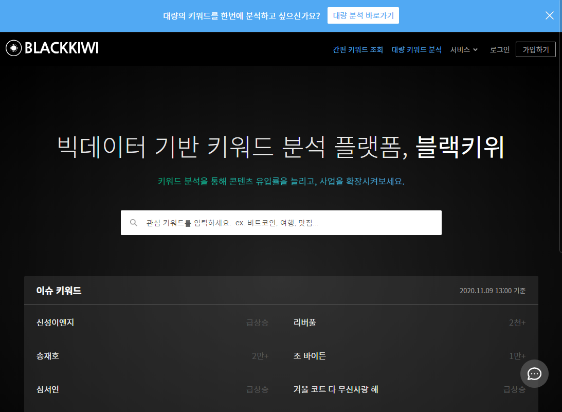 블랙 키위라는 키워드 분석 사이트를 알게 되었는데요. 연관 키워드를 찾아볼 때 좋아서 공유해보려고 가져와봤습니다.