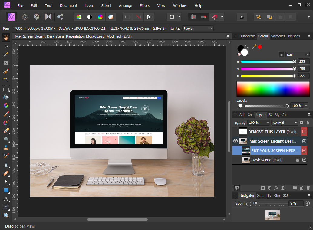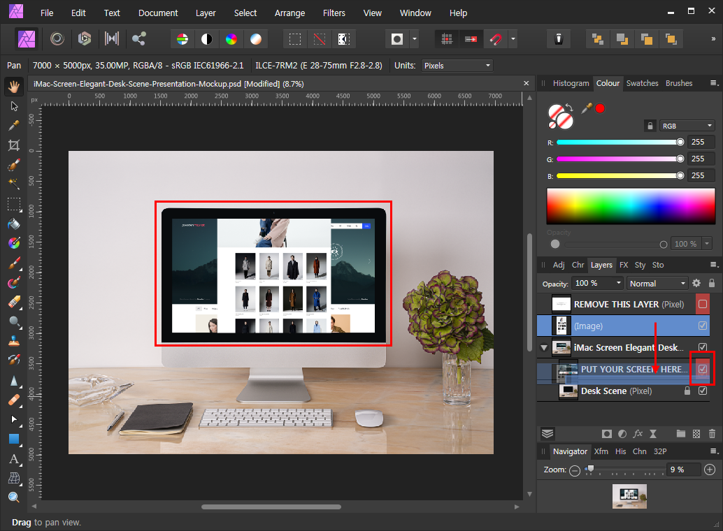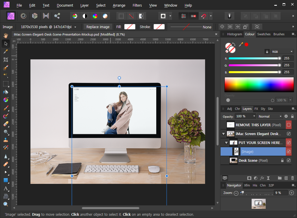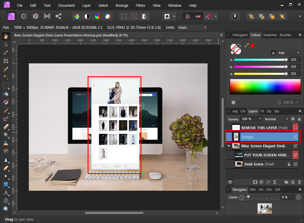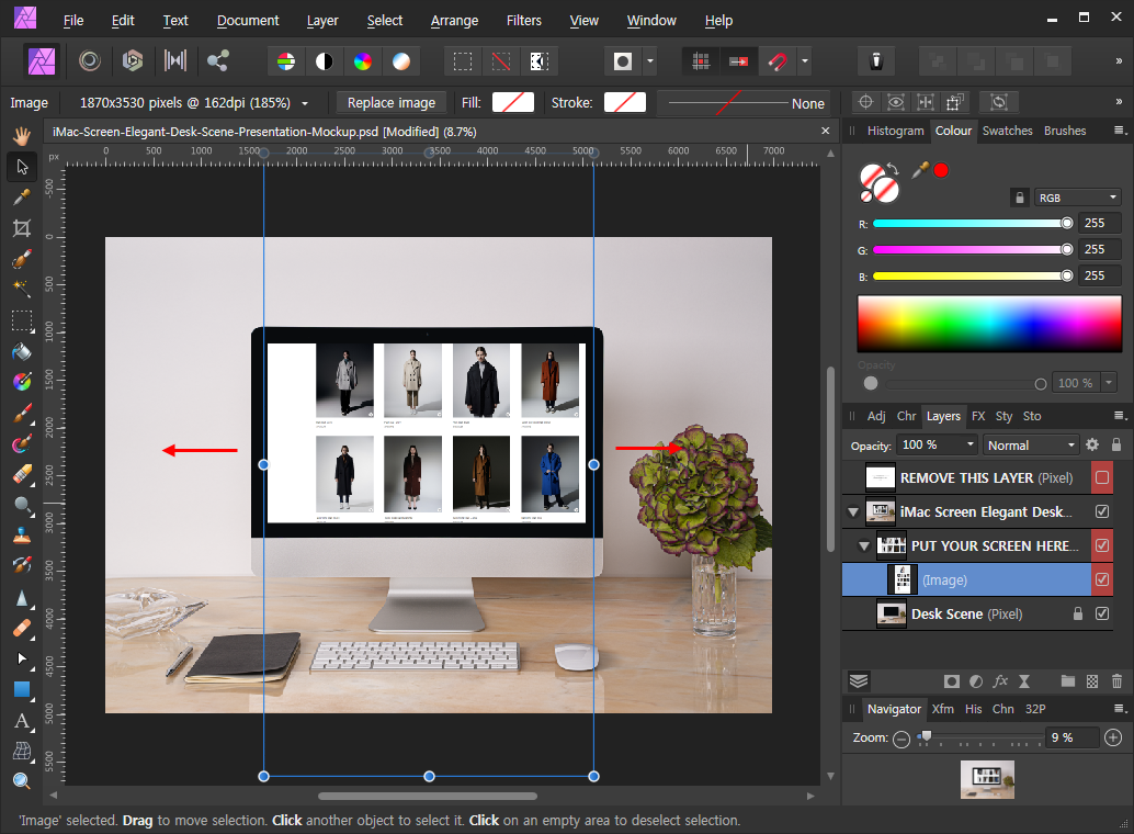 간편하게 목업을 이용할 수 있는 방법입니다. 이미지를 기존 목업에 있는 샘플 이미지 레이어로 드래그해줍니다. 마우스에서 손가락을 떼지 않은 상태에서도 화면이 바뀌는 것을 보실 수 있습니다. 마치 마스크를 씌운 것처럼 변하게 됩니다.