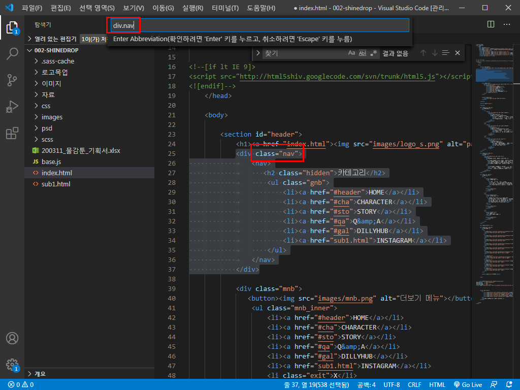 클래스를 호출할때 .(마침표)를 쓰는 것 알고 계실 겁니다. 응용하여 태그명.클래스명 형식으로 입력하면 클래스도 넣어줄 수 있습니다. <div>태그에 nav라는 클래스명을 넣고 싶다면 div.nav 라고 입력하면 된다는 것이죠.
