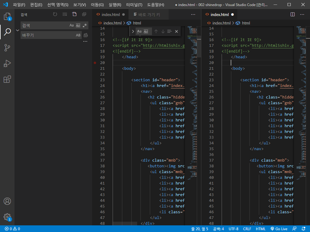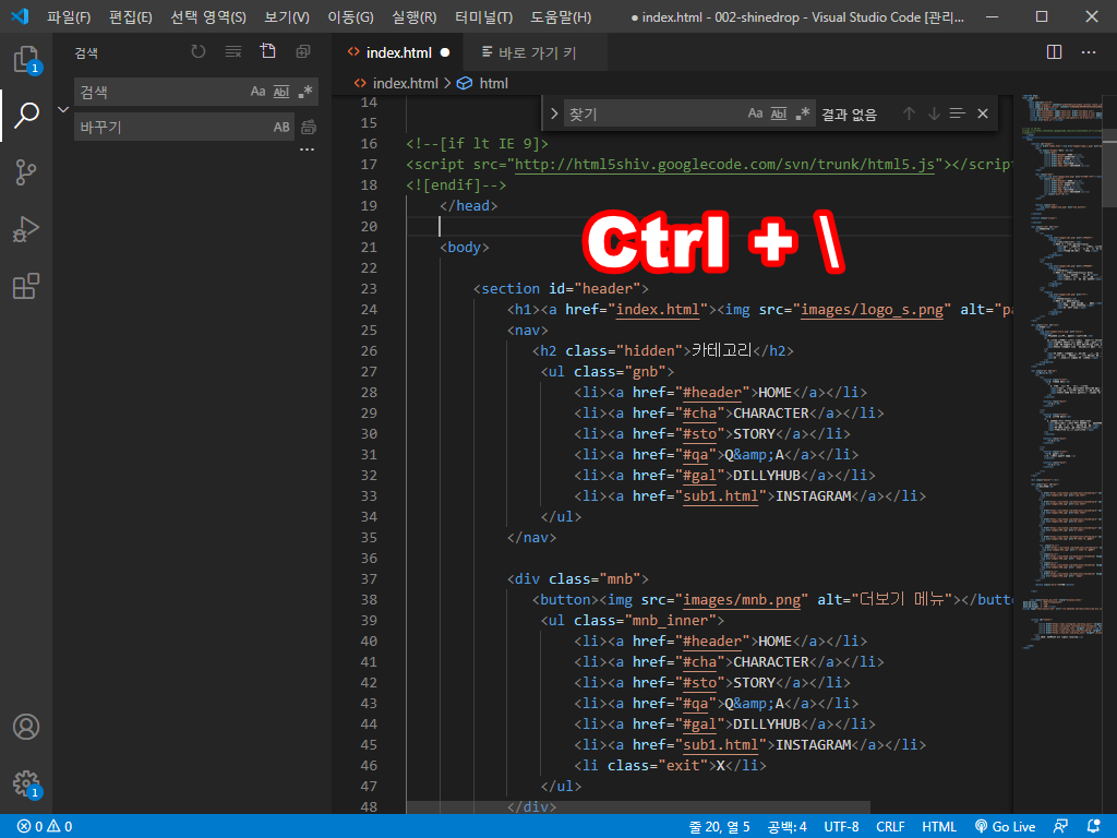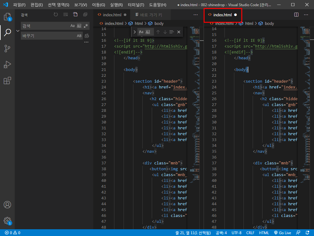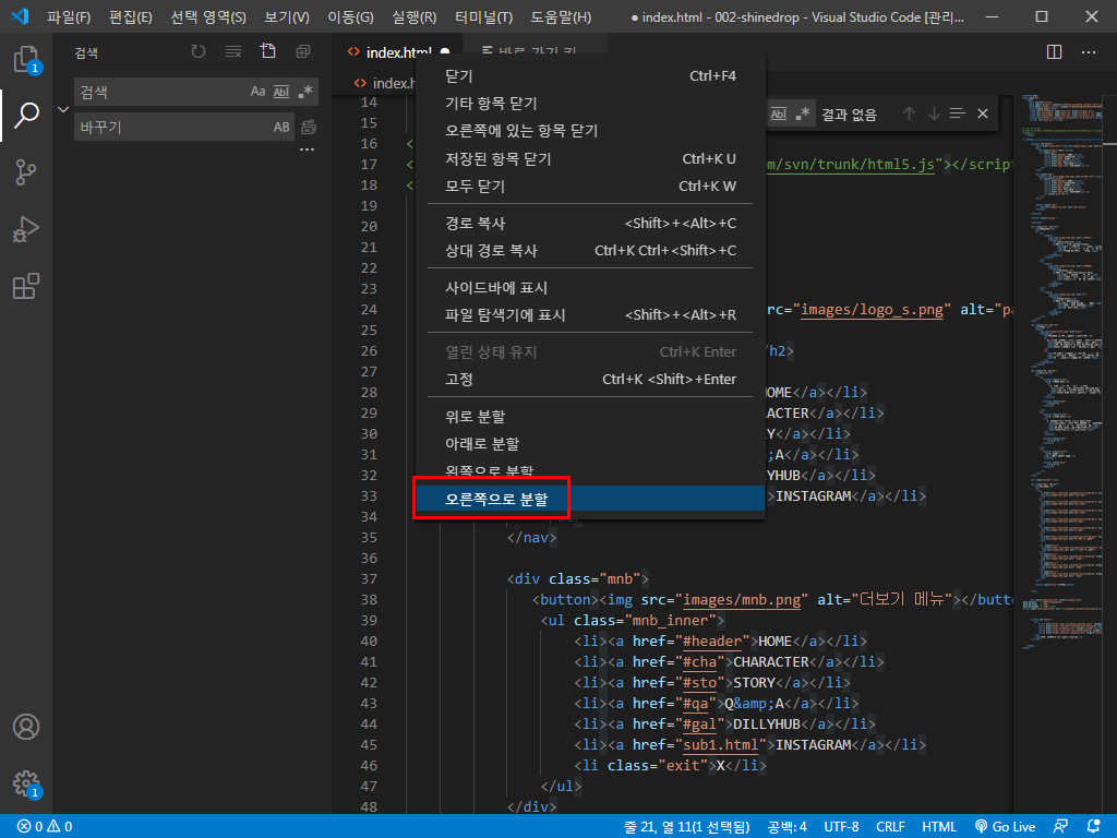 비주얼 스튜디오 코드에서 화면 분할을 해볼게요.