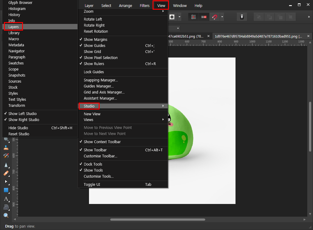 View>Studio>Layers를 클릭하면 레이어 패널이 나타날 것입니다. 메뉴에서 바로 보이지 않아서 찾기 힘들지만 한 번 알아두면 유용하게 사용 가능합니다.