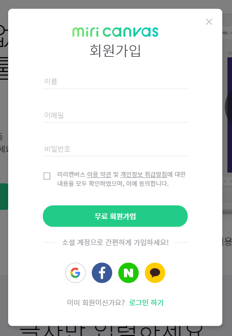 이름, 이메일, 비밀번호 3가지만 있으면 간편하게 회원가입이 가능하고 소셜 계정으로도 가입이 가능합니다. 원하는 방법으로 가입해봅시다.