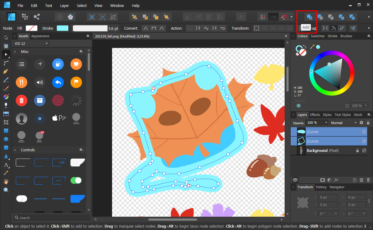레이어를 모두 선택하셨다면 오른쪽 상단에 있는 네모와 동그라미가 모두 색칠된 아이콘을 선택해주시면 됩니다. 마우스를 올리면 Add라고 표시됩니다. 일러스트레이터에서 패스파인더와 같은 기능을 해주는 친구입니다.