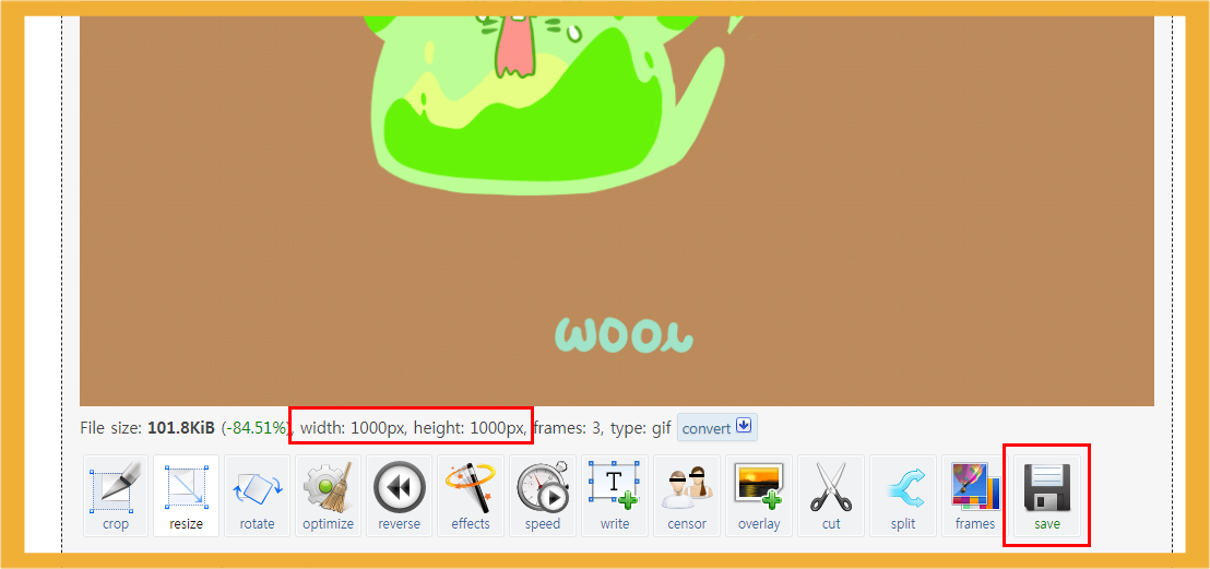 오늘은 리사이즈만 다뤄보겠습니다. 상단 메뉴 중 Resize 메뉴를 클릭합니다. 리사이즈는 말 그대로 사이즈를 편집해주는 기능입니다. 움짤이 너무 클 때 사용하시면 됩니다. 크게 늘리는 것은 이미지가 깨지니 주의해주세요.
