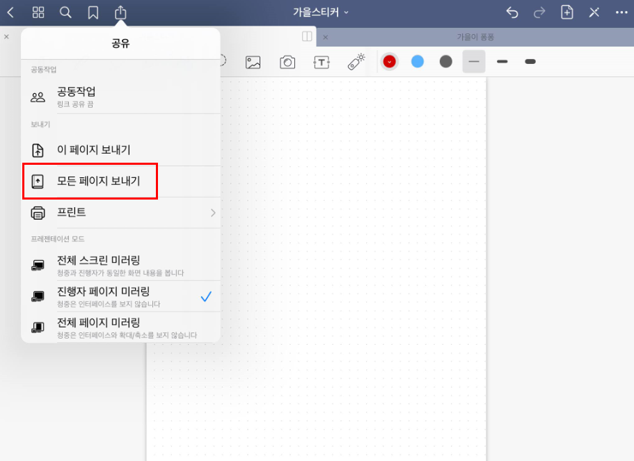 - 공유 메뉴가 열리면 이 페이지 보내기와 모든 페이지 보내기로 파일 공유가 가능합니다.