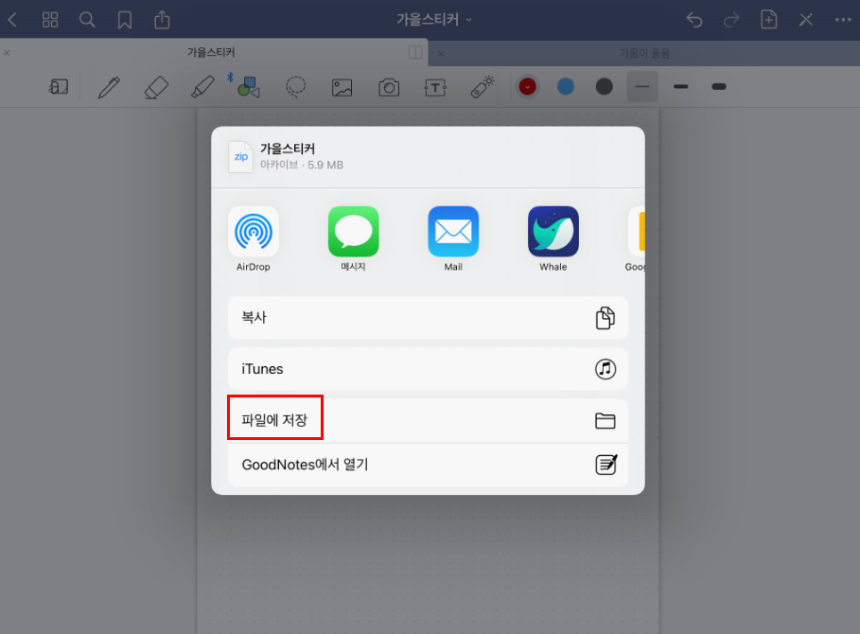 ① 파일에 저장을 눌러 굿노트 파일을 저장해줍니다.