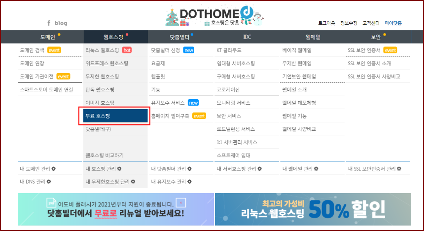 ① 웹호스팅 > 무료 호스팅 메뉴로 들어갑니다.