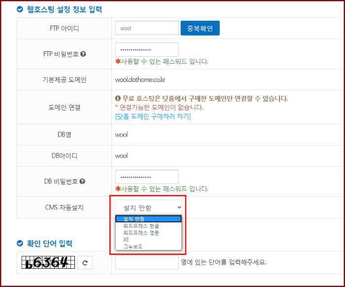 ③ 워드프레스를 사용할 것이라면 CMS 자동 설치에서 워드프레스를 선택해주세요.