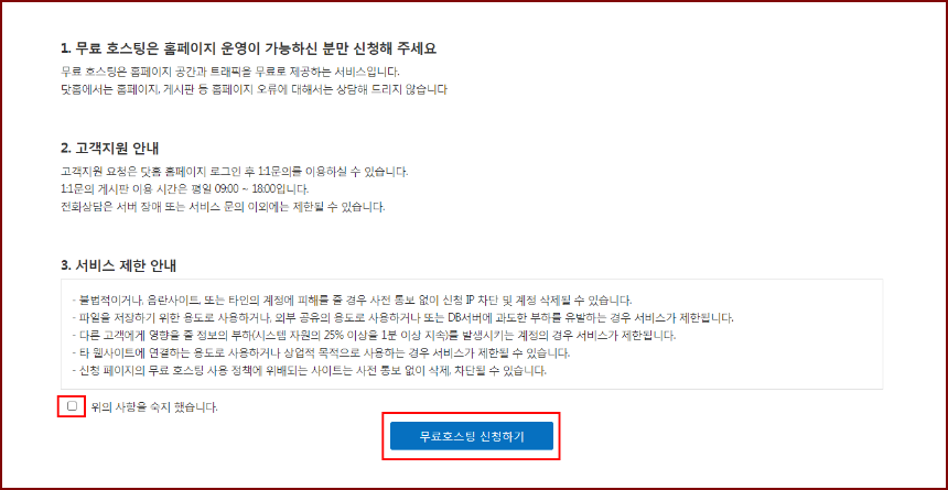 ③ 체크 후 무료호스팅 신청하기 버튼을 눌러줍니다.