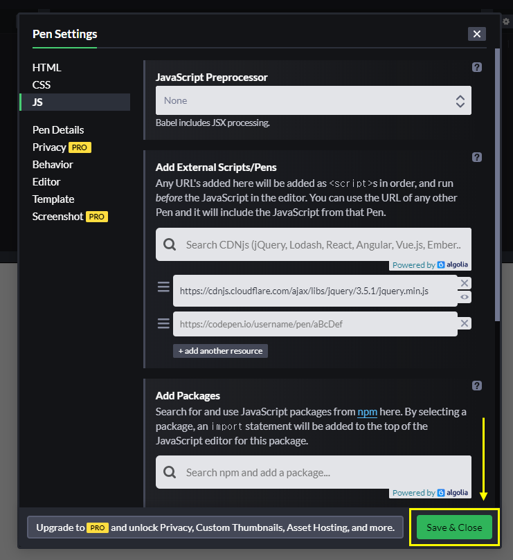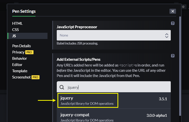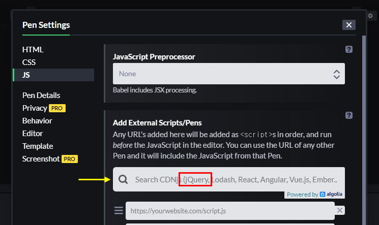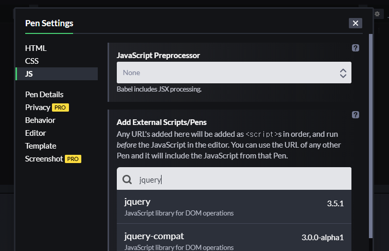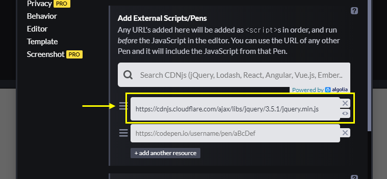 오늘은 코드펜에서 제이쿼리를 불러오는 방법을 알아보겠습니다. 이미지처럼 CDN을 불러와보겠습니다.