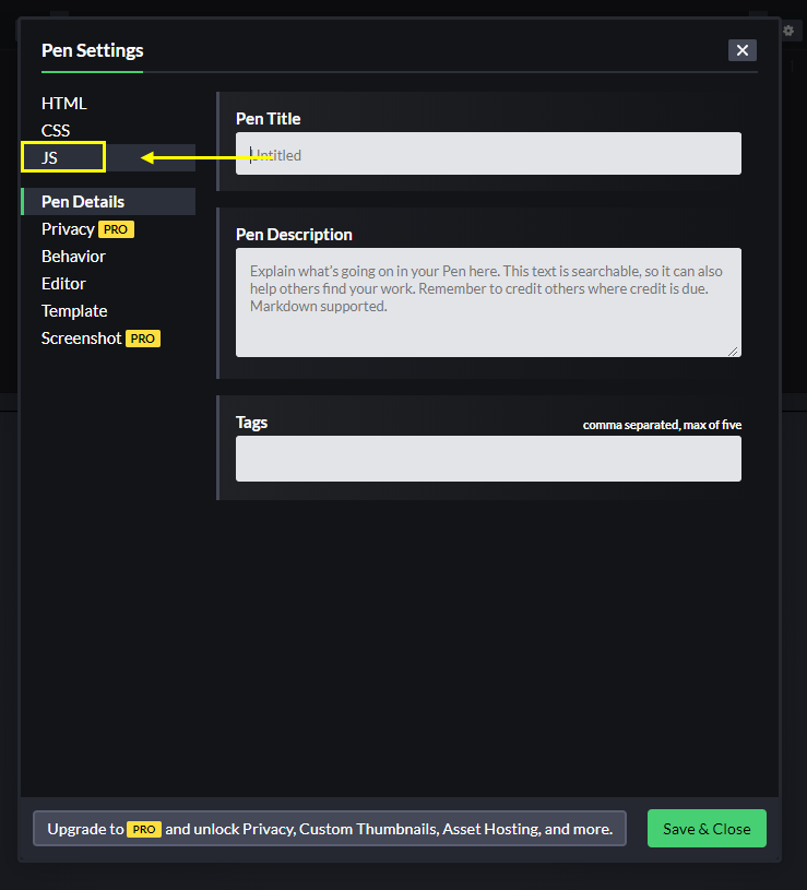 - 세팅 창 왼쪽에서 JS 탭을 선택합니다.