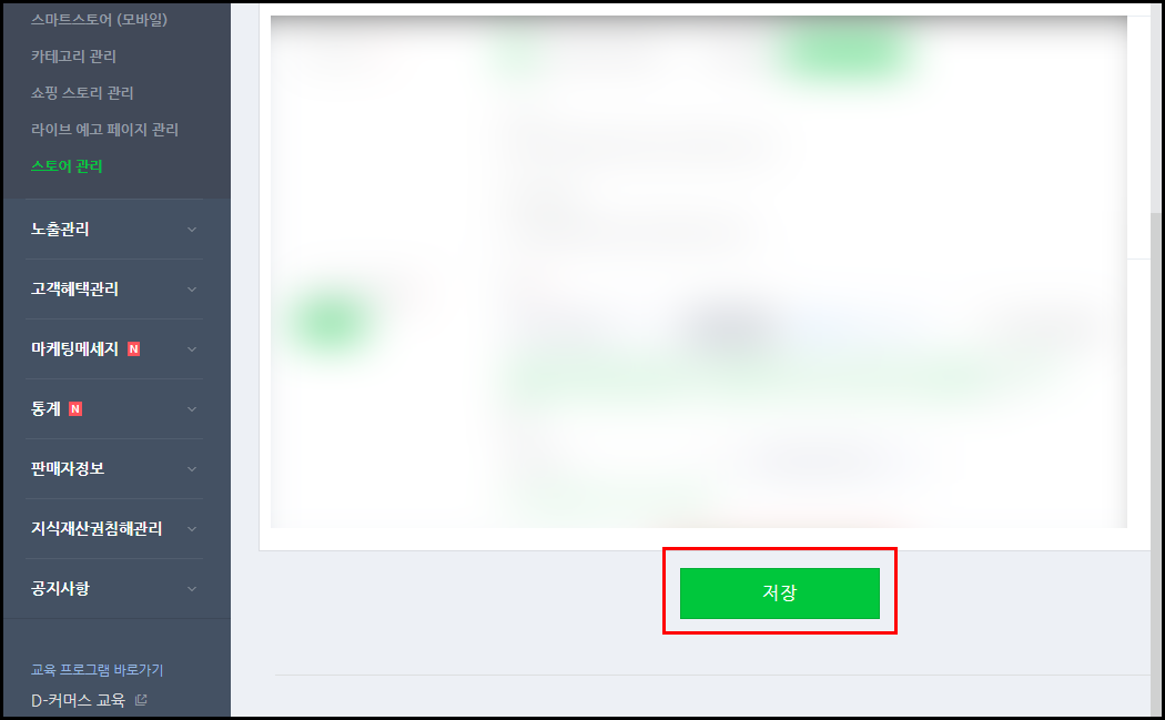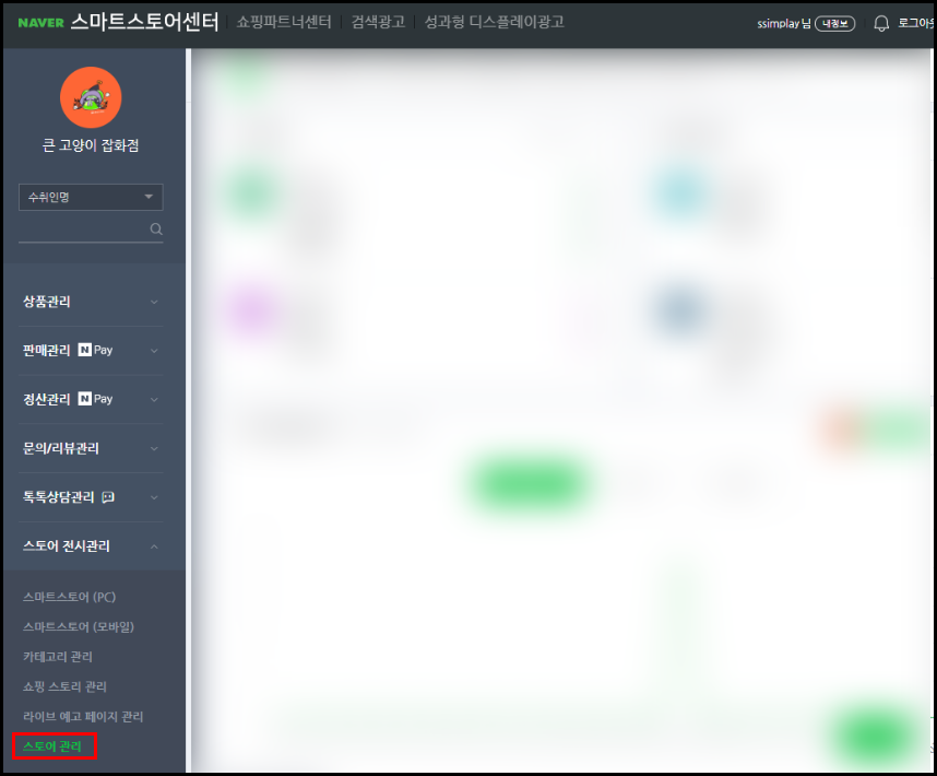 - 왼쪽 메뉴 중 스토어 전시관리 > 스토어 관리 메뉴를 클릭합니다.