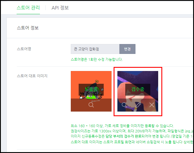 - 스토어 관리 페이지에 접속하면 두 번째 칸에 스토어 대표 이미지를 변경할 수 있는 칸이 보입니다.