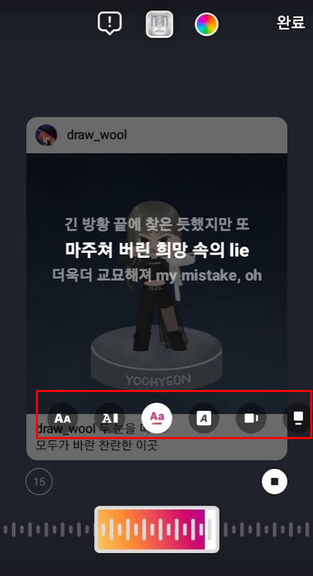 - 원하는 색으로 변경 후 완료를 누르면 스토리에 노래 넣기 완성!