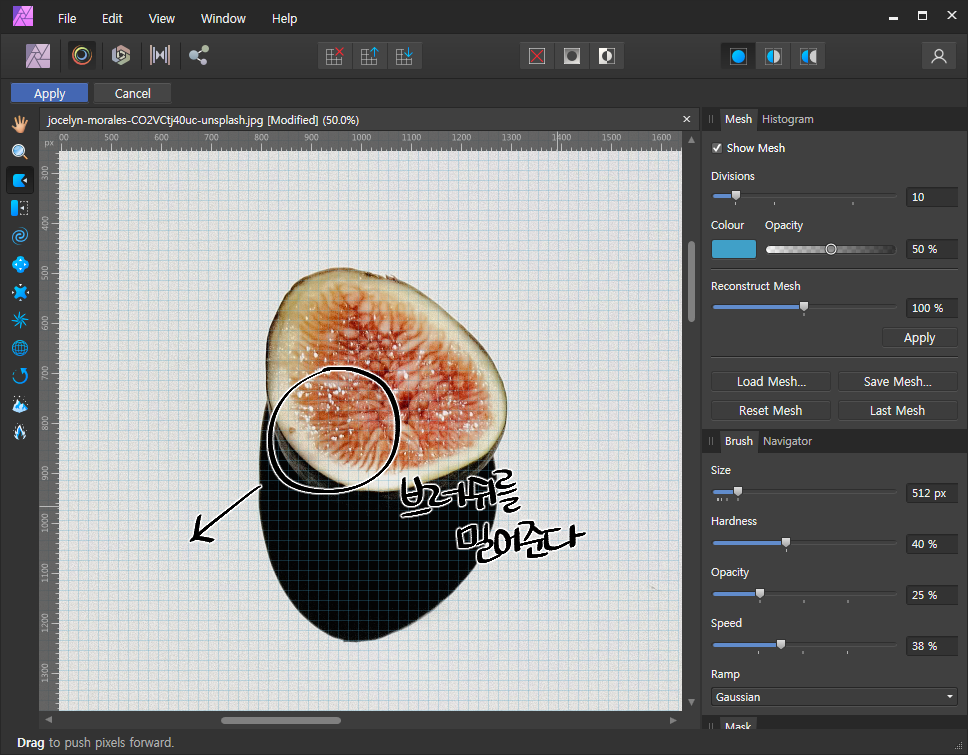 - 브러쉬의 크기를 조절해주고 이미지를 변경하고 싶은 방향으로 살짝 밀어줍니다.
