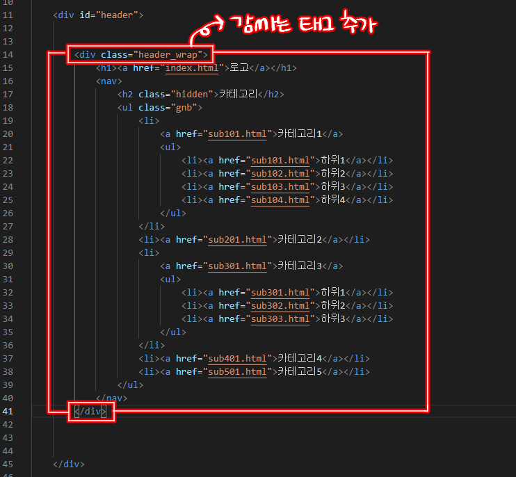 - 시각적으로 잘 보이기 위해 #header에는 검은색 테두리를 .header_wrap에는 빨간색 테두리를 넣어주었습니다.
