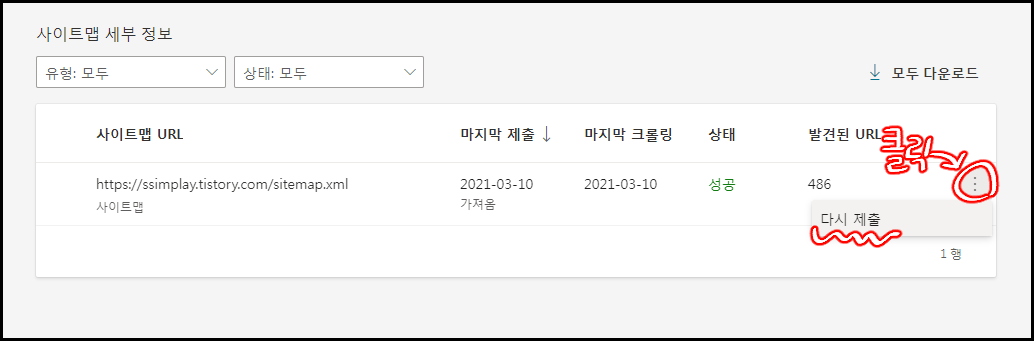 - 여전히 안된다면 상단에 사이트맵 제출 버튼을 눌러 새로 제출해줍니다.